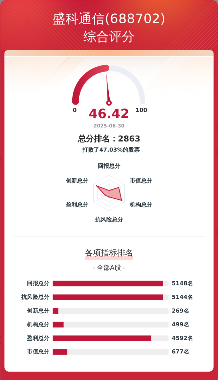 金融界上市公司研究院构建了一套上市公司韧性评价体系,从企业盈利、科技创新、股东回报、经营抗风险、市值表现及机构吸引力六个维度对企业进行量化评分,满分为100分。盛科通信的韧性评价总分为46.42分,在A股5405家可比上市公司中排名第2863位。